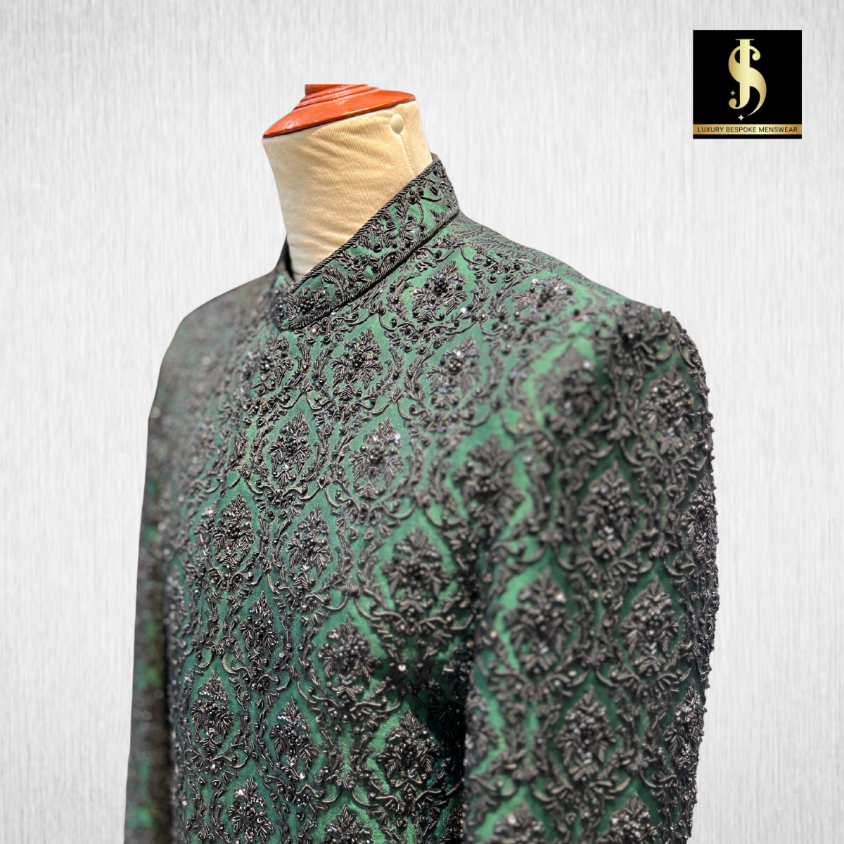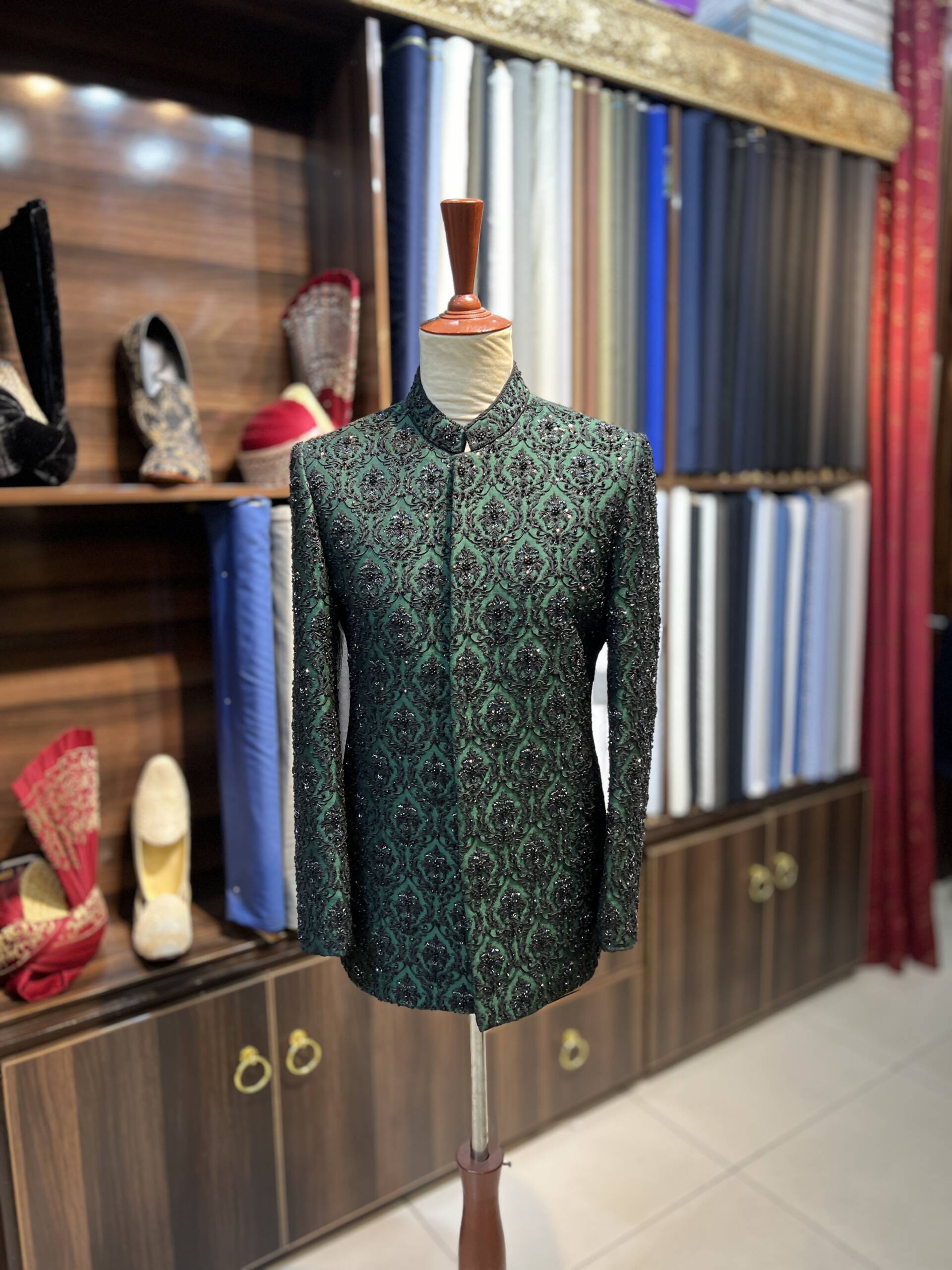 Step into the spotlight with this Emerald Green Embroidered Prince Coat, designed for the modern groom and fashion-conscious men. Featuring an exquisite pattern with delicate black embellishments, this coat blends luxury with tradition, making it an ideal choice for weddings, receptions, and festive occasions.