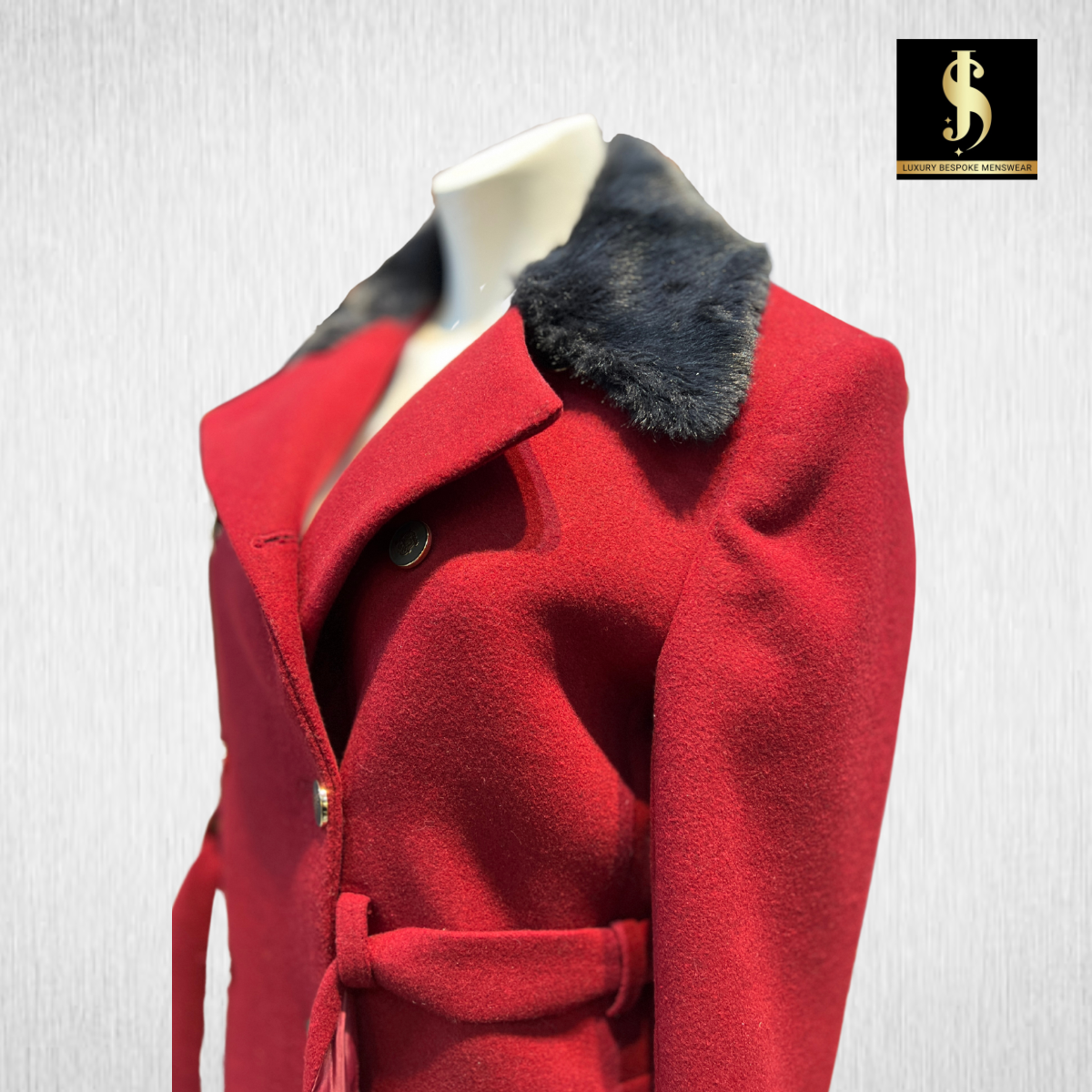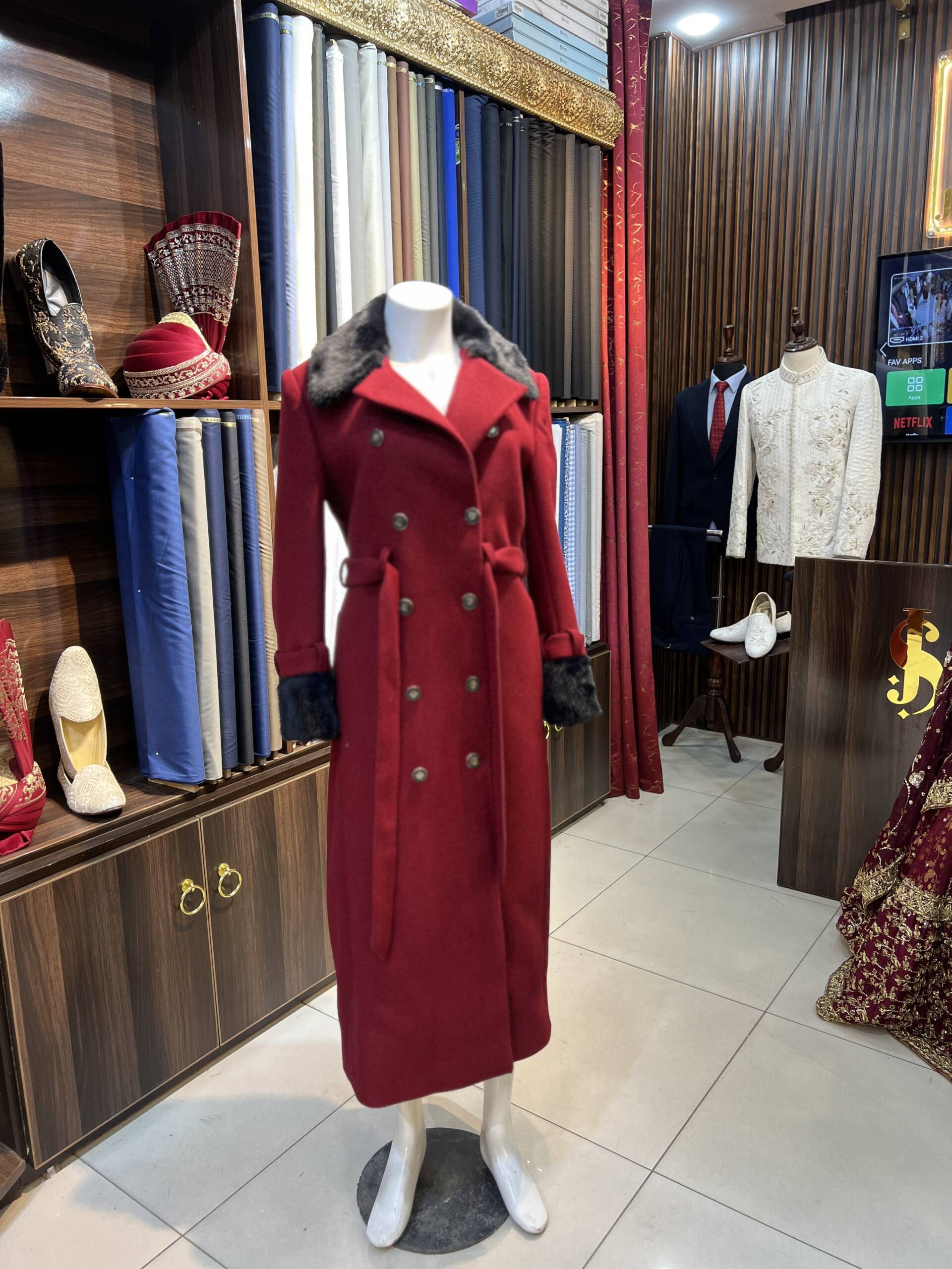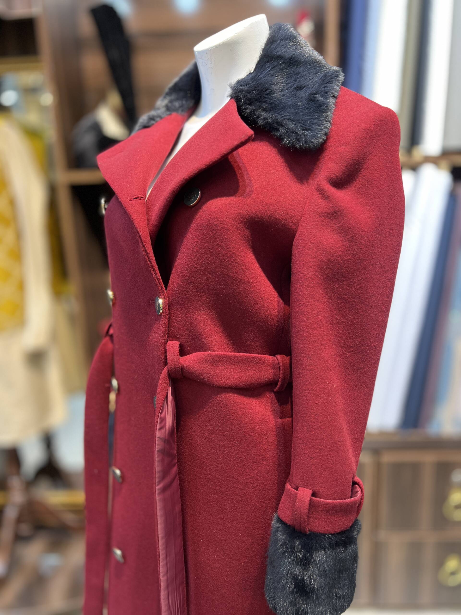 Stay warm and stylish with this Maroon Wool Trench Coat, featuring a luxurious fur collar and cuffs. The double-breasted design with gold-tone buttons adds a sophisticated touch, making it a must-have for winter fashion.